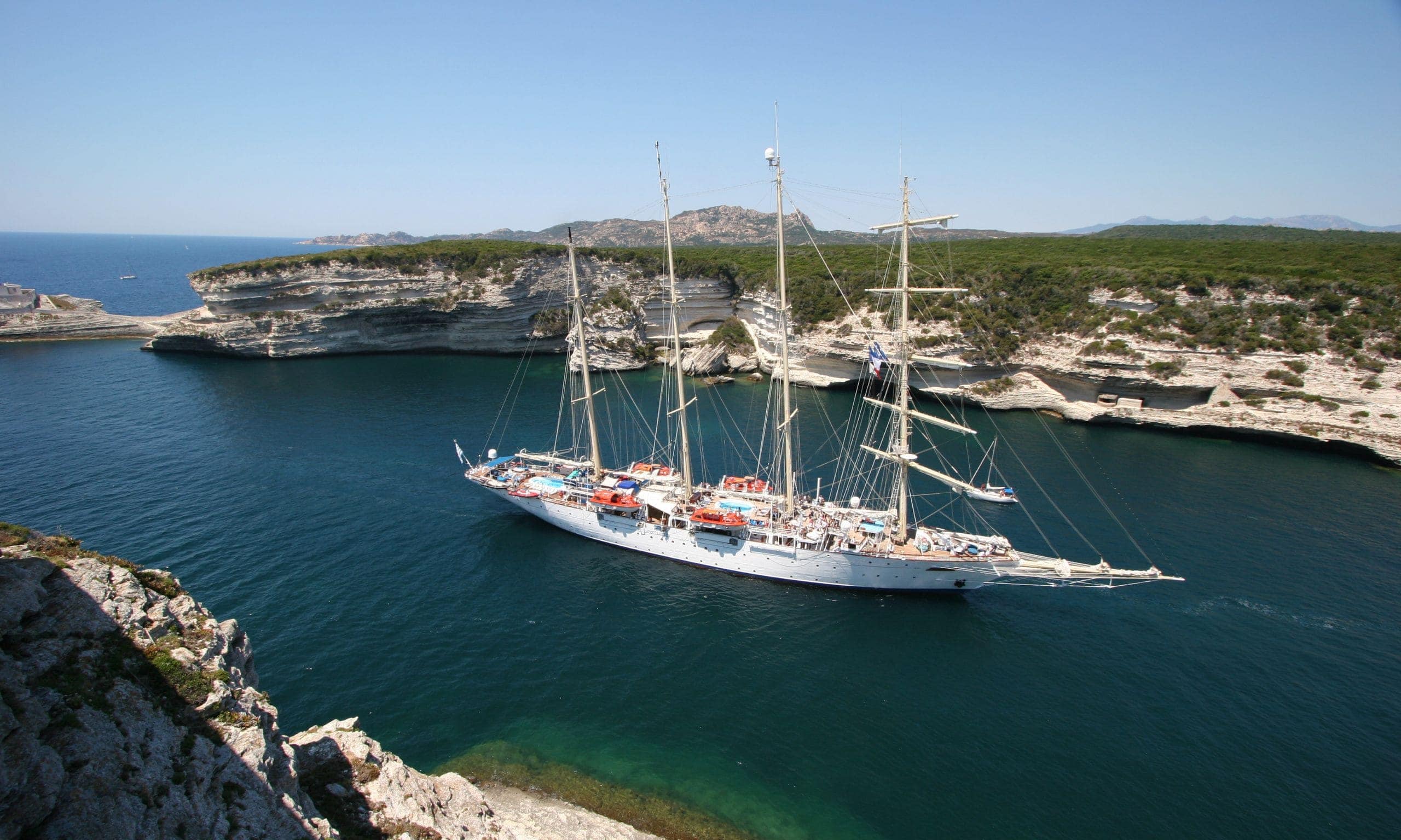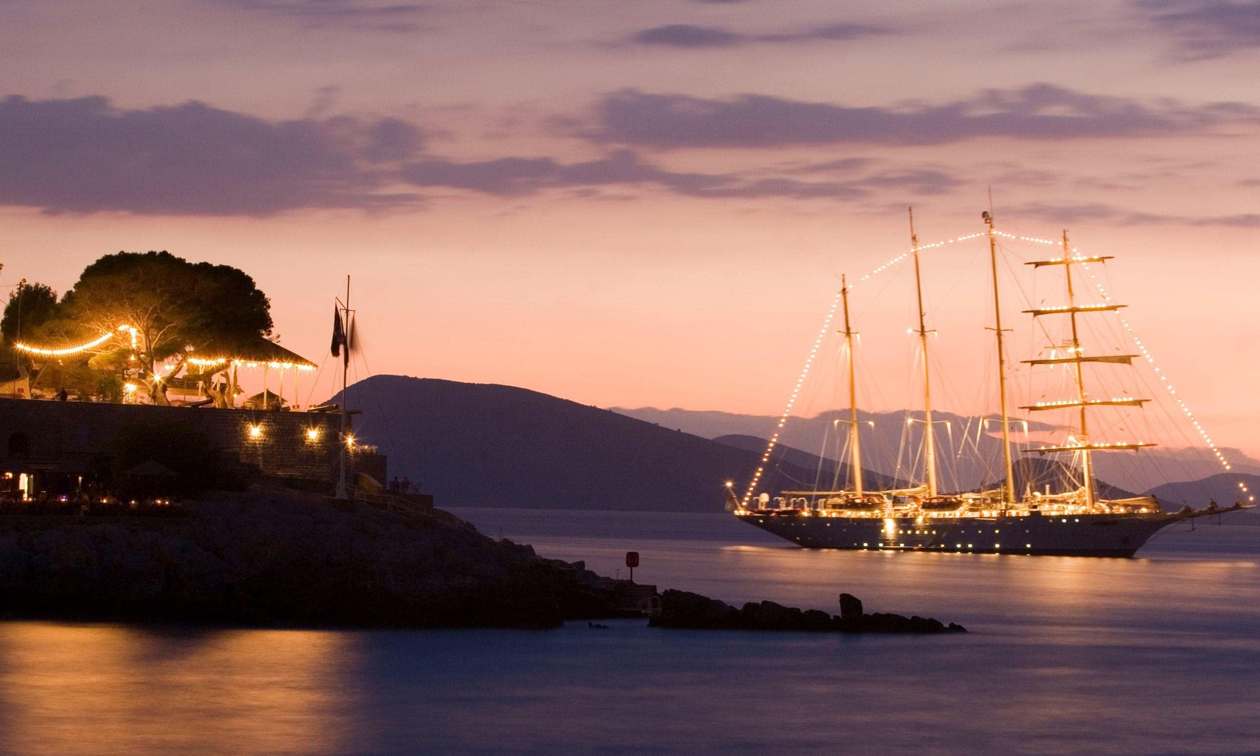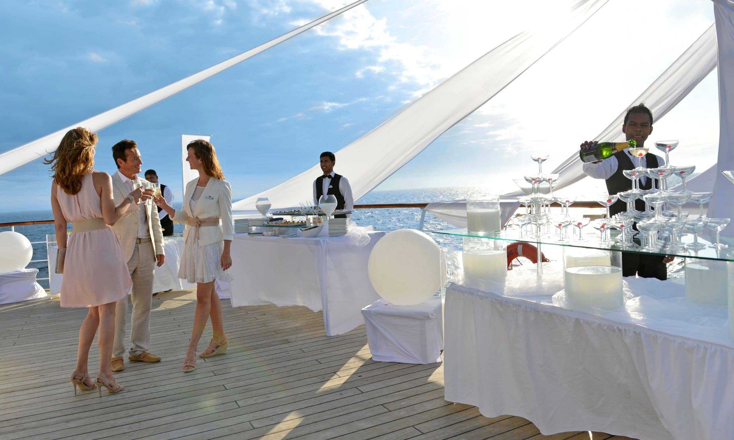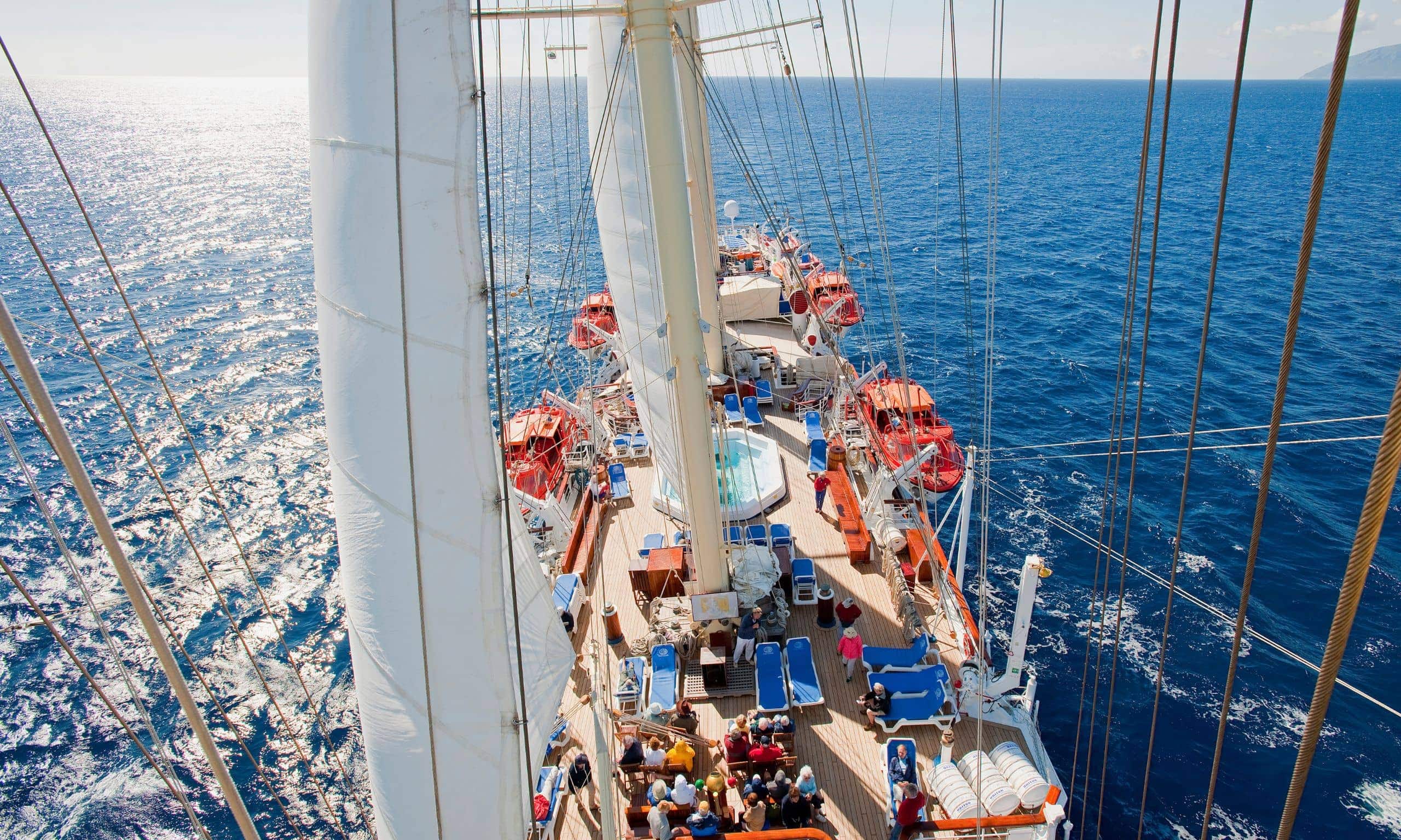 Ihr nächstes Firmenevent oder Incentive darf anders werden als je zuvor? Mal kein klassisches Hotel für 30 oder 300 Gäste, keine Städtereise – dafür ein Hauch von Abenteuer? Dann schließen Sie für einen Moment die Augen und stellen sich vor, wie Sie die Gangway zu einem Schiff überschreiten. Kein Riesengroßes. Auch kein gewöhnliches Kreuzfahrtschiff. Es ist ein Segelschiff. Ein Imposantes indes, denn es beherbergt Kabinen für 230 Passagiere, Salons, Restaurants und eine Bar, ein Pooldeck, ja sogar einen Spa! Aus seinem teakhölzernen Rumpf ragen fünf mächtige Masten in den Himmel. Daran 5.000 (!) Quadratmeter Segelfläche. Sie stehen in einem pittoresken Hafen an Deck dieses Schiffes, der Rosé perlt in dem Glas in Ihrer Hand, der Himmel verkündet den nahen Sonnenuntergang. Schon bald wird er in allen Farben des Pastells erstrahlen. Ihre Gäste warten gespannt. Dann ist es soweit. Die Stimme des Kapitäns tönt über das Schiff. „Leinen los!“ Bootsmänner setzen sich in Bewegung, nehmen die armdicken Taue auf, die den 130 Meter langen Segler eben noch an der Pier hielten. Wie in Zeitlupe drückt er sich von der Kaimauer ab, dreht ein wenig bei und gleitet entlang der Hafenanlagen, vorbei an Menschen, die Ihnen winken, durch die gewaltigen Hafentore hinaus aufs Meer.