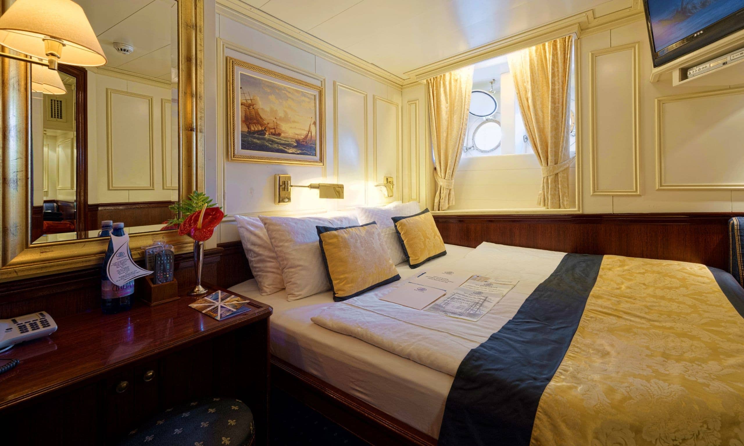- 79 Kabinen: 70 außen, 8 luxuriöse Kabinen mit direktem Zugang zum Deck, 1 große Eignerkabine